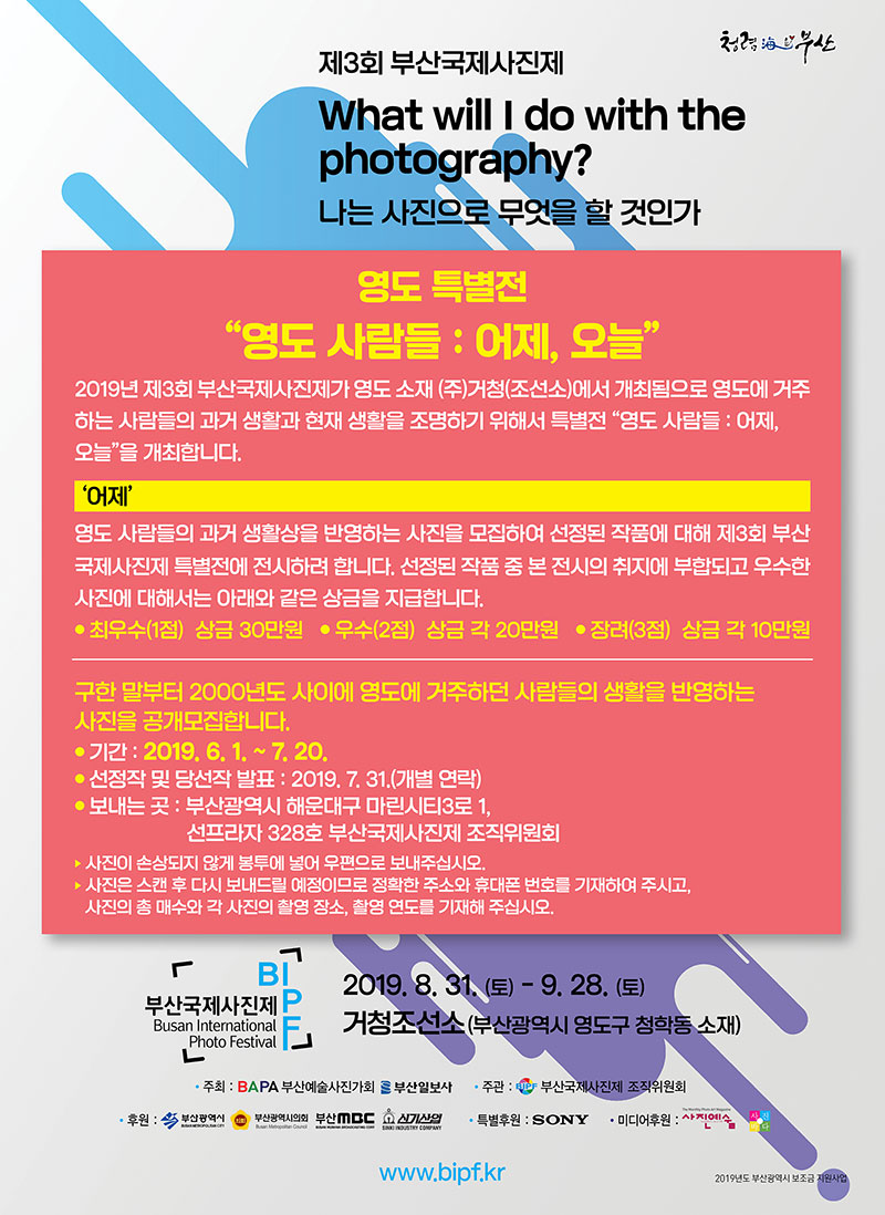 2019년 제3회 부산 국제 사진제 주제는 “나는 사진으로 무엇을 할 것인가?” What will I do with the photography?로서 이성, 감성, 직관의 상호작용으로 형성되는 시대적 자아를 통해서 작가들이 사진으로 무엇을 어떻게 하는가를 보면서 자아, 타아, 그리고 그 너머를 사진에서 살펴보고자 한다.