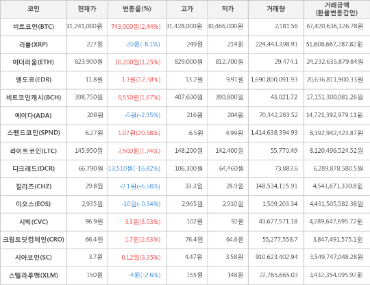 비트코인, 리플, 이더리움, 엔도르, 비트코인캐시, 에이다, 스펜드코인, 라이트코인, 디크레드, 칠리즈, 이오스, 시빅, 크립토닷컴체인, 시아코인, 스텔라루멘