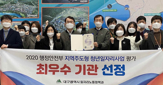 2020년 행정안전부 지역주도형 청년일자리사업 평가에서 최우수 기관으로 선정된 대구시 직원들이 시청에서 기념촬영을 하고 있다. 대구시 제공