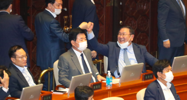 30일 오후 국회 본회의에서 전월세상한제와 계약갱신청구권을 도입하는 내용의 주택임대차보호법이 통과되자 더불어민주당 김태년 원내대표가 이광재 의원과 주먹인사를 하고 있다./연합뉴스