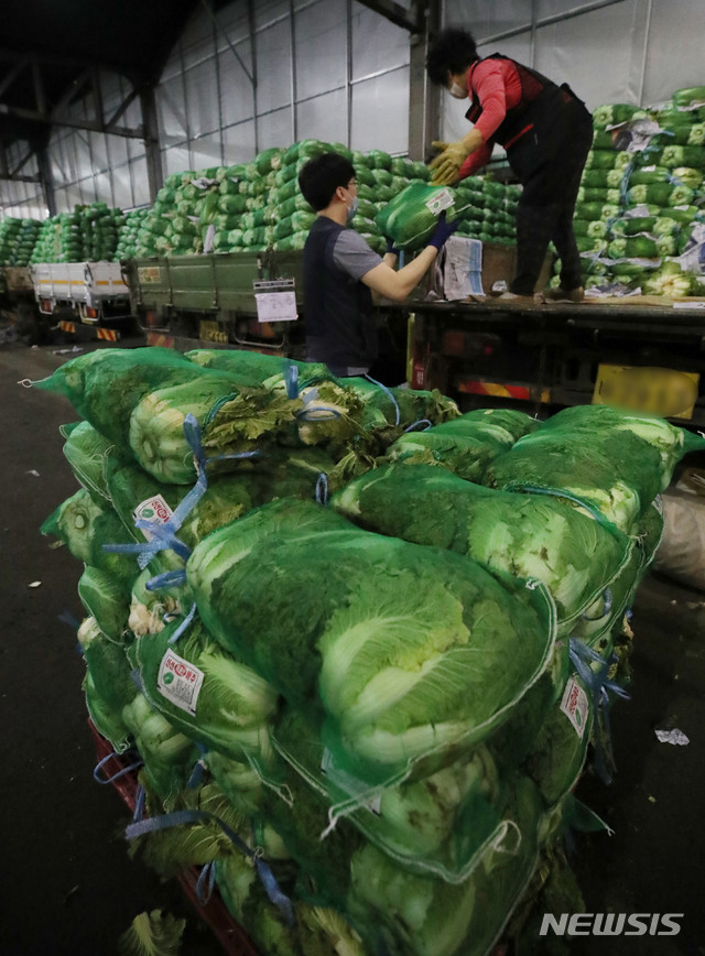 [서울=뉴시스] 박미소 기자 = 22일 서울 송파구 가락시장 청과시장 배추 경매 현장에서 상인들이 배추를 옮기고 있다. 2020.09.22.
