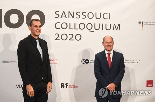 German Minister of Finance Olaf Scholz and Szabolcs Dull, the former editor-in-chief of one of the biggest Hungarian news websites, the 'index.hu pose for photo during the award ceremony of the international media conference M100 Sanssouci Colloquium in Potsdam, Brandenburg, Germany, 17 September 2020. The international forum brings together Europe's top editors, commentators and media owners (print, broadcasting and internet) alongside key public figures to assess the role and impact of the media in international affairs and to promote democracy and freedom of expression and speech. EPA/FILIP SINGER