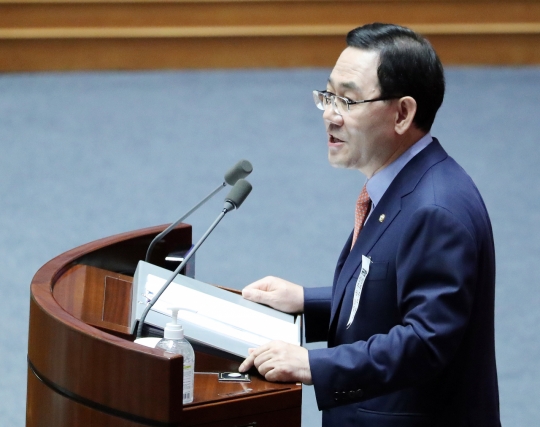 주호영 미래통합당 원내대표가 21일 오전 국회 본회의장에서 교섭단체 대표 연설을 하고 있다. [연합]