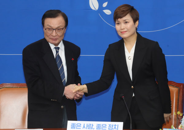 지난 1월 30일 오전 더불어민주당 이해찬 대표가 국회 당대표실에서 열린 인재영입 발표회에 참석해 영입인재 15호 전 핸드볼국가대표 임오경 씨와 악수하고 있다. /연합뉴스