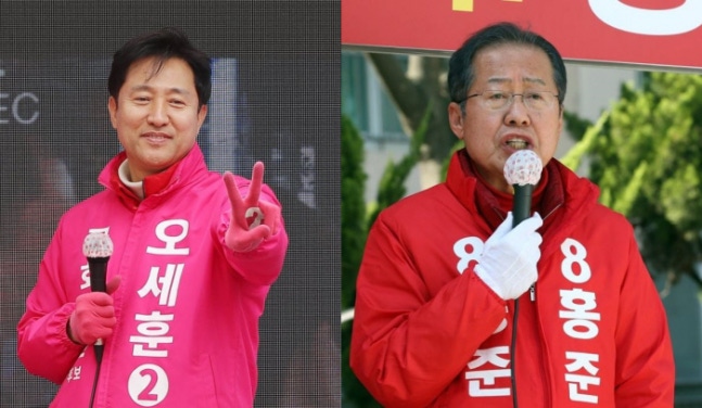 왼쪽부터 오세훈 전 서울시장과 무소속 홍준표 의원. 연합뉴스