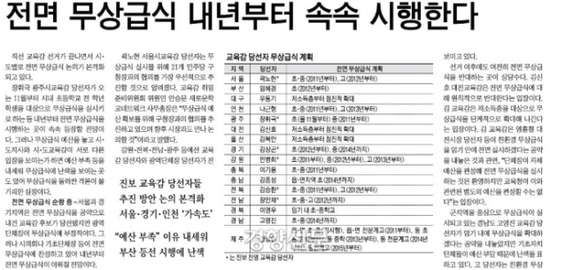 무상급식 소식을 전한 경향신문 2010년 6월10일자 지면. 경향신문
