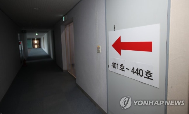 (천안=연합뉴스) 김연수 기자 = 6일 오후 코로나19 경증환자 생활치료센터로 대구,경북외 지역에 처음 설치된 충남 천안시 동남구 우정공무원교육원 생활관 내부에 호실 안내표시가 되어 있다.