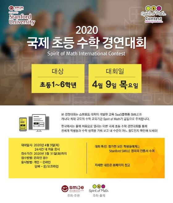 미국 스탠포드대학이 개발한 교육 서비스형 소프트웨어(Software as a Service·SaaS) 플랫폼 스마일(SMILE)과 캐나다 수학교육기관 스프릿오브매쓰(Spirit of Math:SoM)가 공동 주최하는 ‘2020 국제 초등 수학 경연대회’가 개최된다.